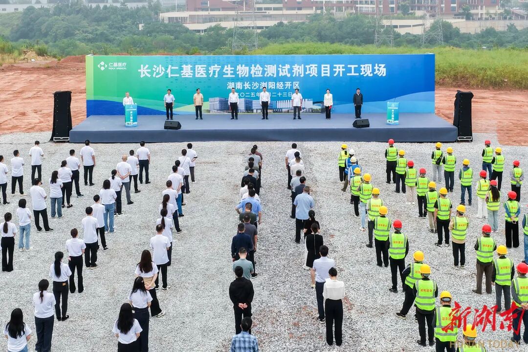 在仁基医疗生物检测试剂项目建设现场,挖机铁臂挥舞,运输车辆往来穿梭,土地平整工作正全力推进,一片热火朝天的景象。
