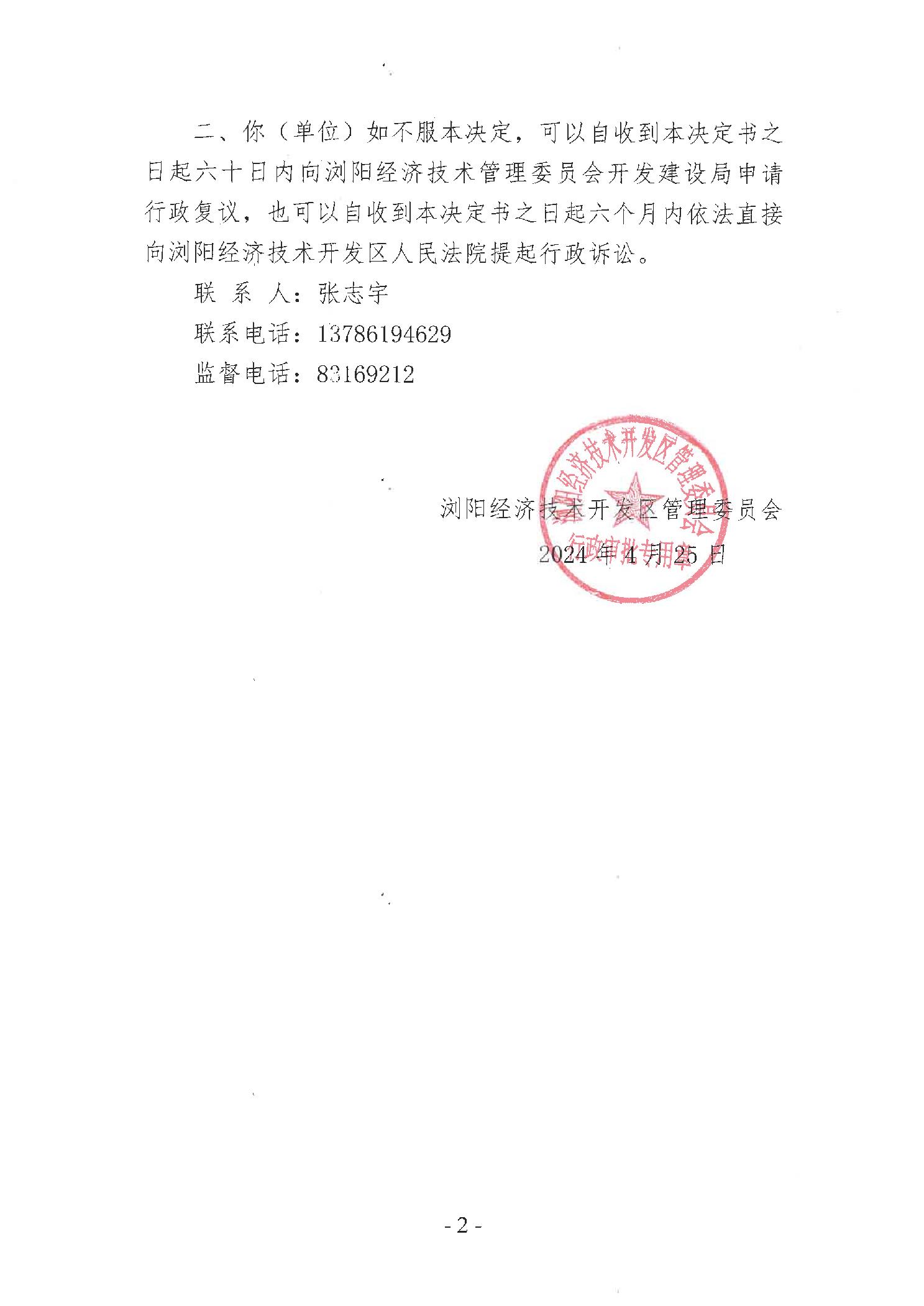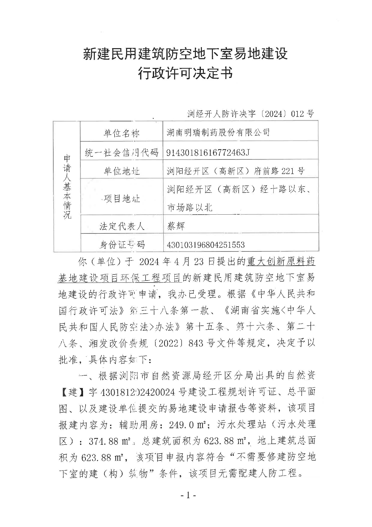 新建民用建筑防空地下室易地建设行政许可决定书 浏经开人防许决字〔2024〕012号