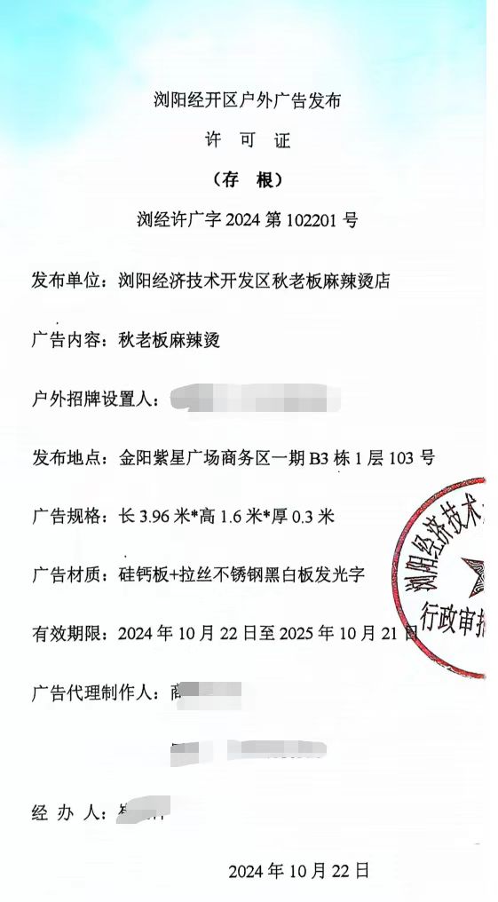 浏阳经开区户外广告发布许可证 浏经许广字2024第102201号