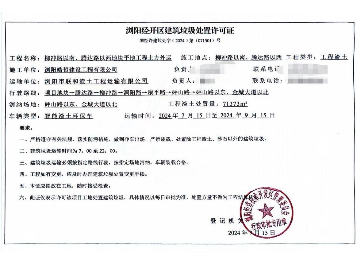 浏阳经开区建筑垃圾处置许可证 浏经许建垃处字(2024)第(071501)号