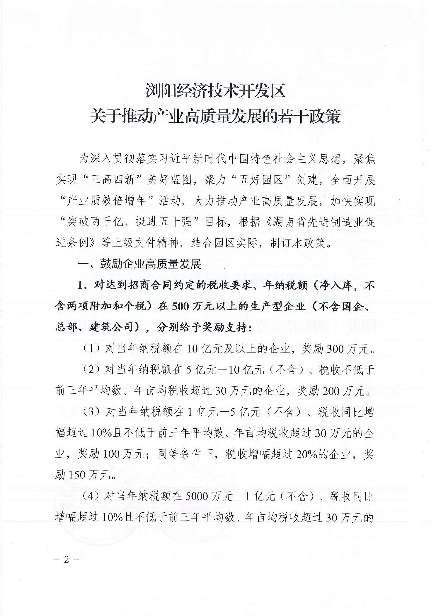 中共浏阳经济技术开发区工作委员会 浏阳经济技术开发区管理委员会印发《浏阳经济技术开发区关于推动产业高质量发展的若干政策》的通知