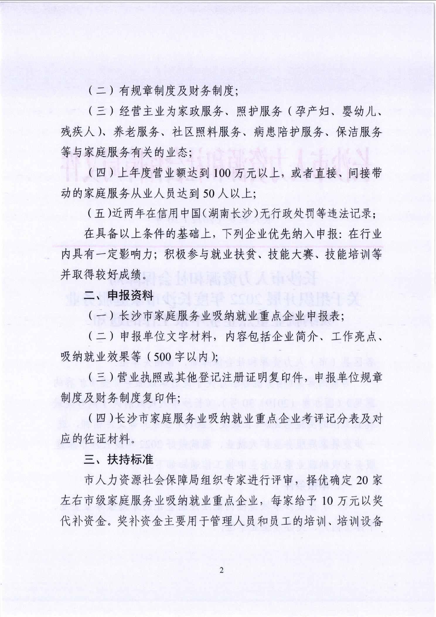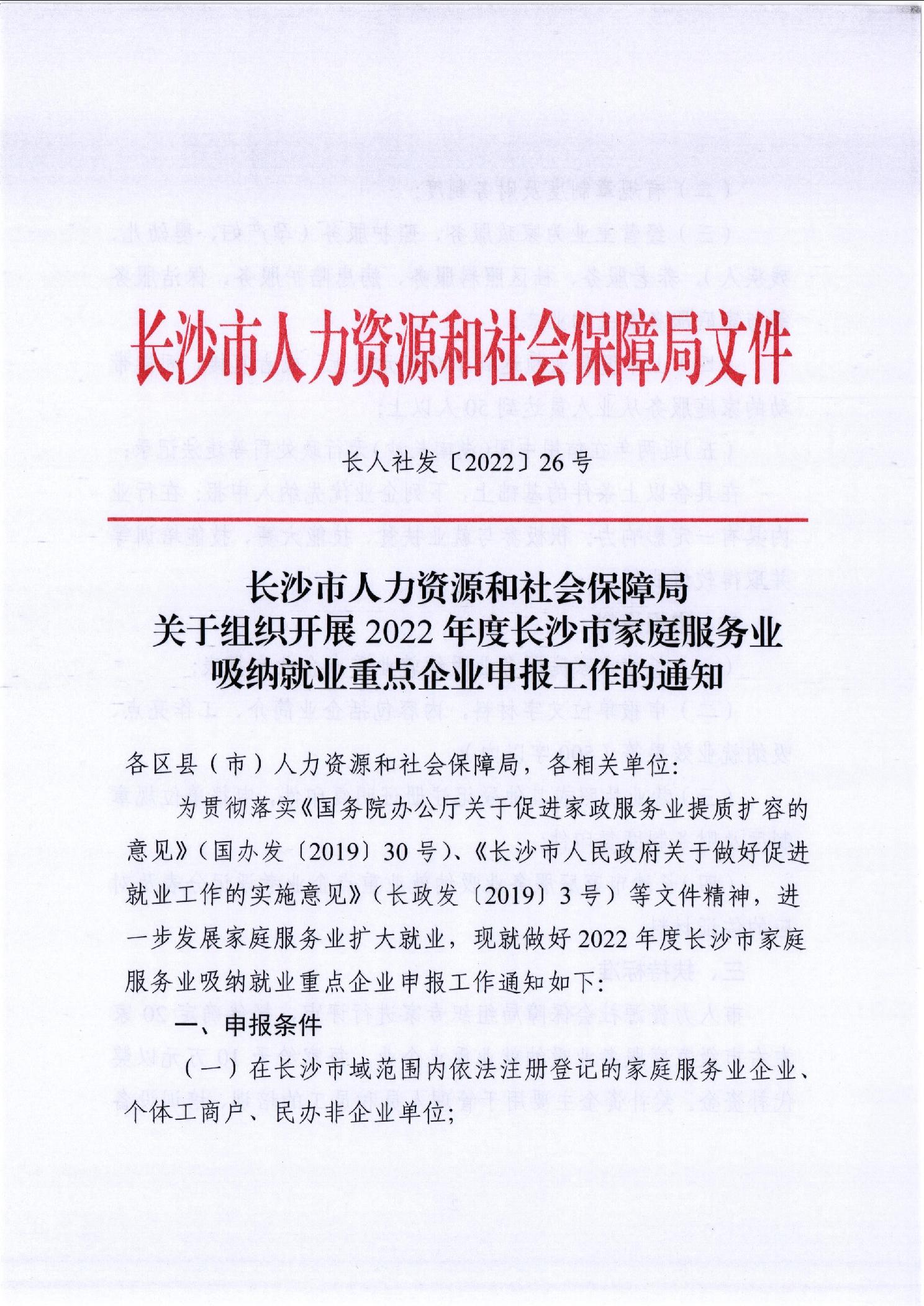 长沙市人力资源和社会保障局 关于组织开展2022年度长沙市家庭服务业吸纳就业重点企业申报工作的通知