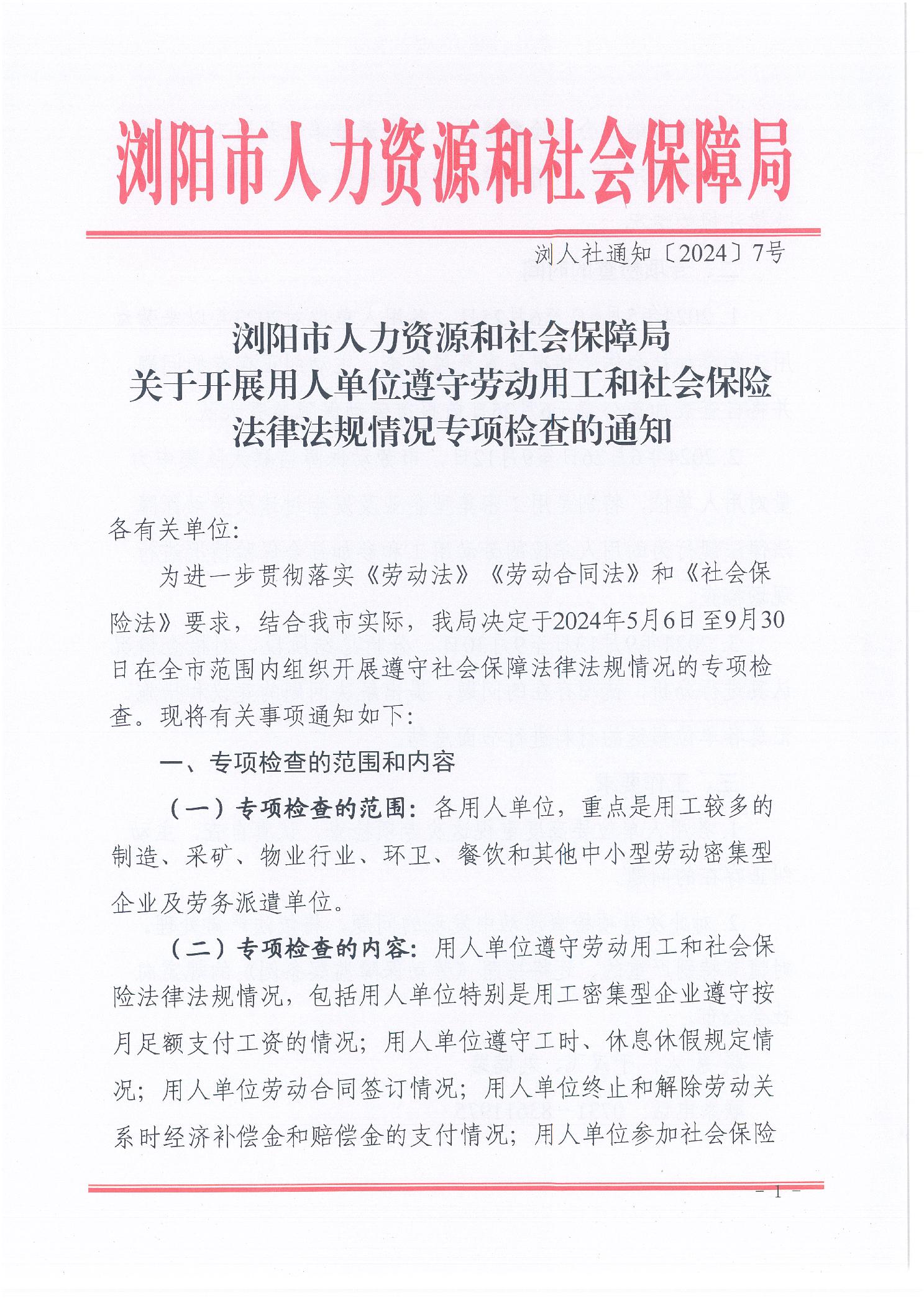浏阳市人力资源和社会保障局关于开展用人单位遵守劳动用工和社会保险法律法规情况专项检查的通知