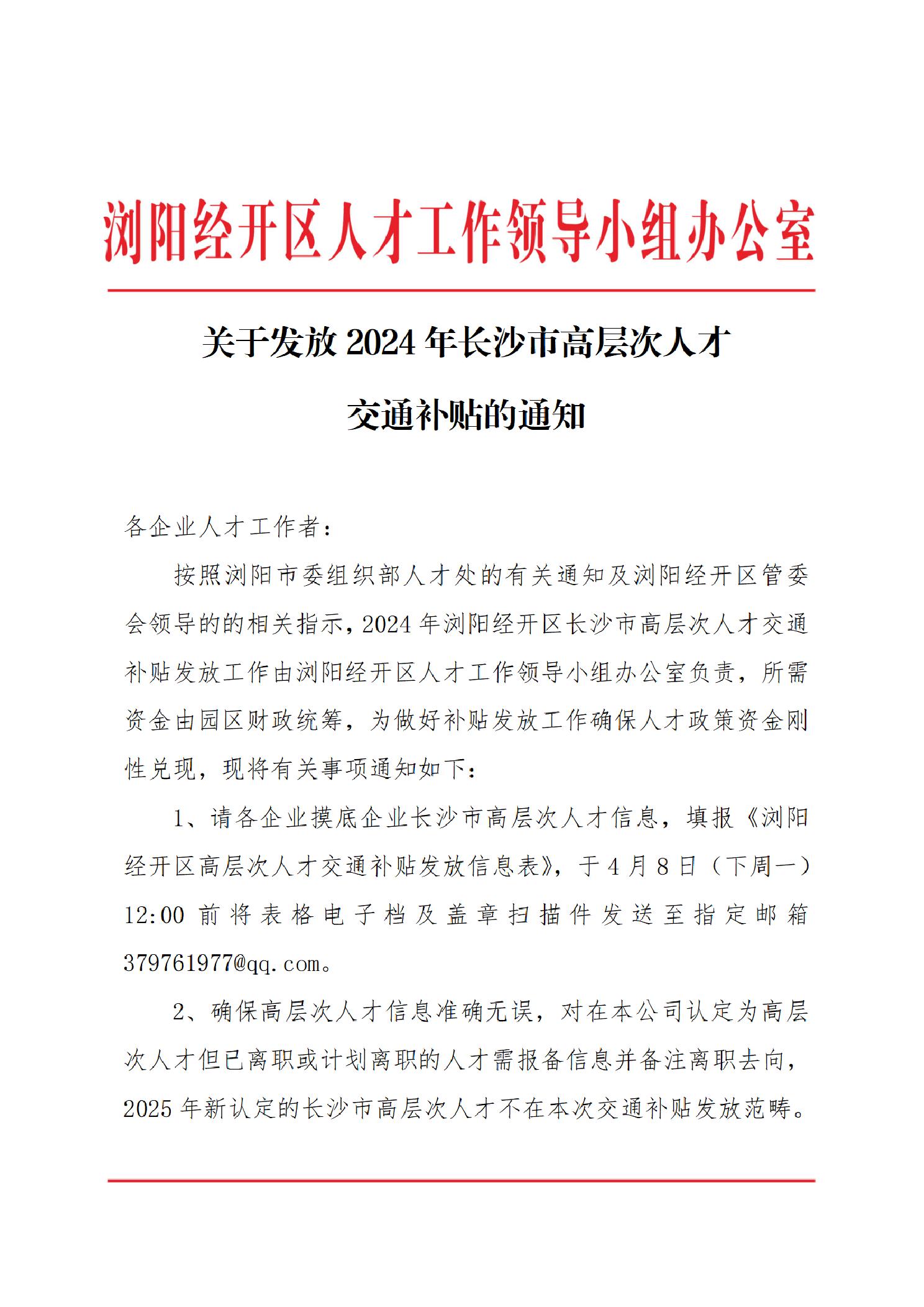 关于发放2024年长沙市高层次人才交通补贴的通知