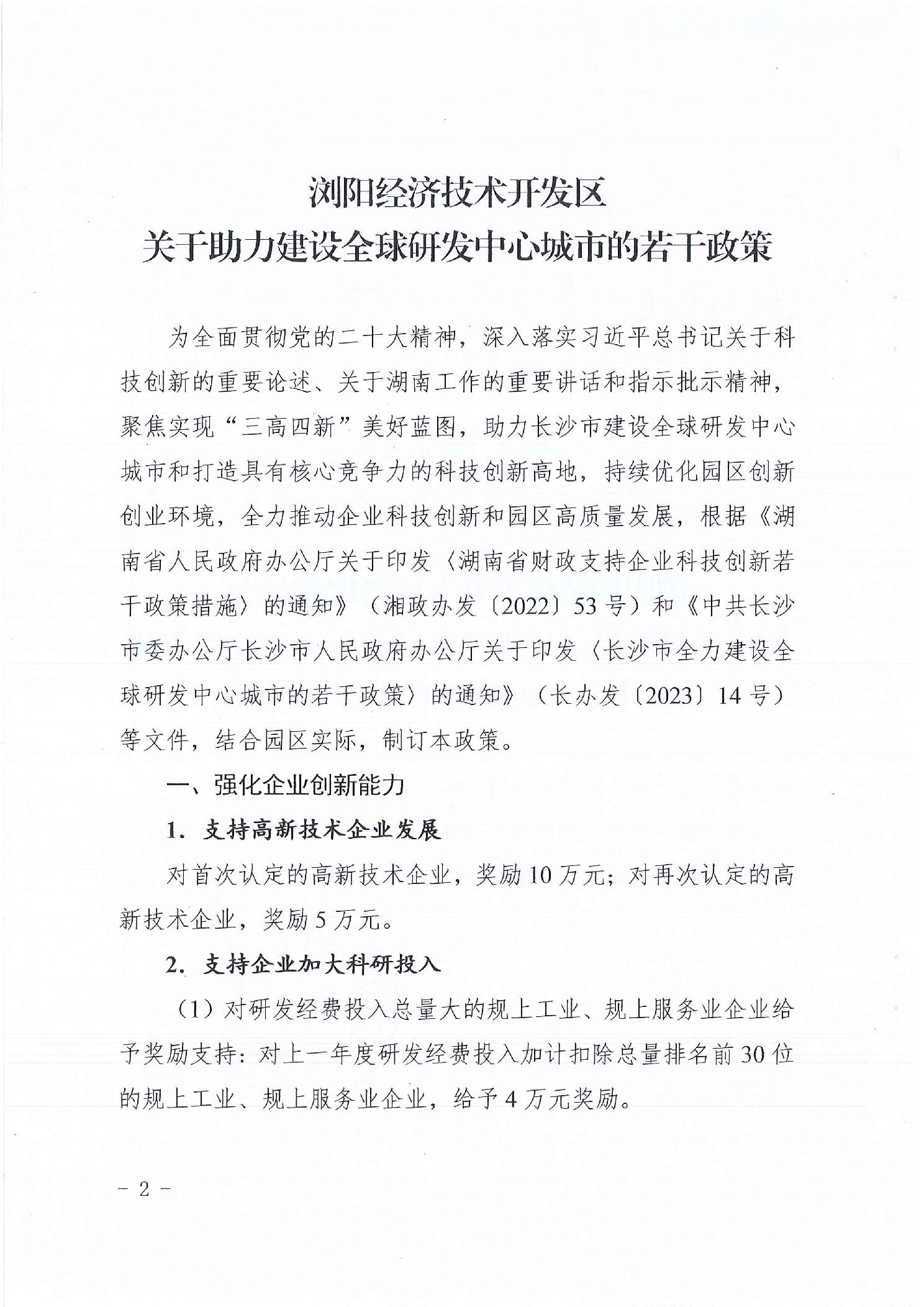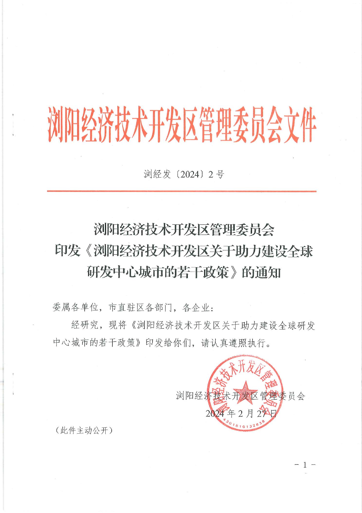 浏阳经济技术开发区管理委员会印发《浏阳经济技术开发区关于助力建设全球研发中心城市的若干政策》的通知